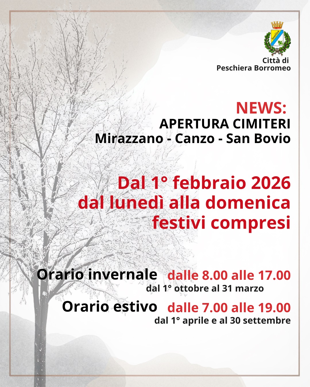 Dal 1 febbraio 2026 gli orari dei cimiteri di Mirazzano, Canzo e San Bovio saranno i seguenti (dal lunedì alla domenica, festivi compresi):